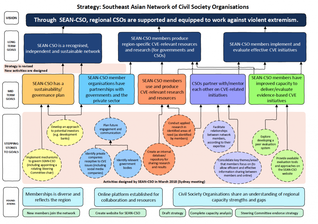 The South East Asian Network of Civil Society Organisations (SEAN-CSO) works to counter violent extremism in South East Asia. On Tuesday 27 February 2018, the Steering Committee of SEAN-CSO endorsed a Strategy that outlines what the Network wants to achieve in the short, medium and long term. Through achievement of the short, mid and long term goals, the Network will progress toward the vision that “through SEAN-CSO, regional civil society organisations are supported and equipped to work against violent extremism”.